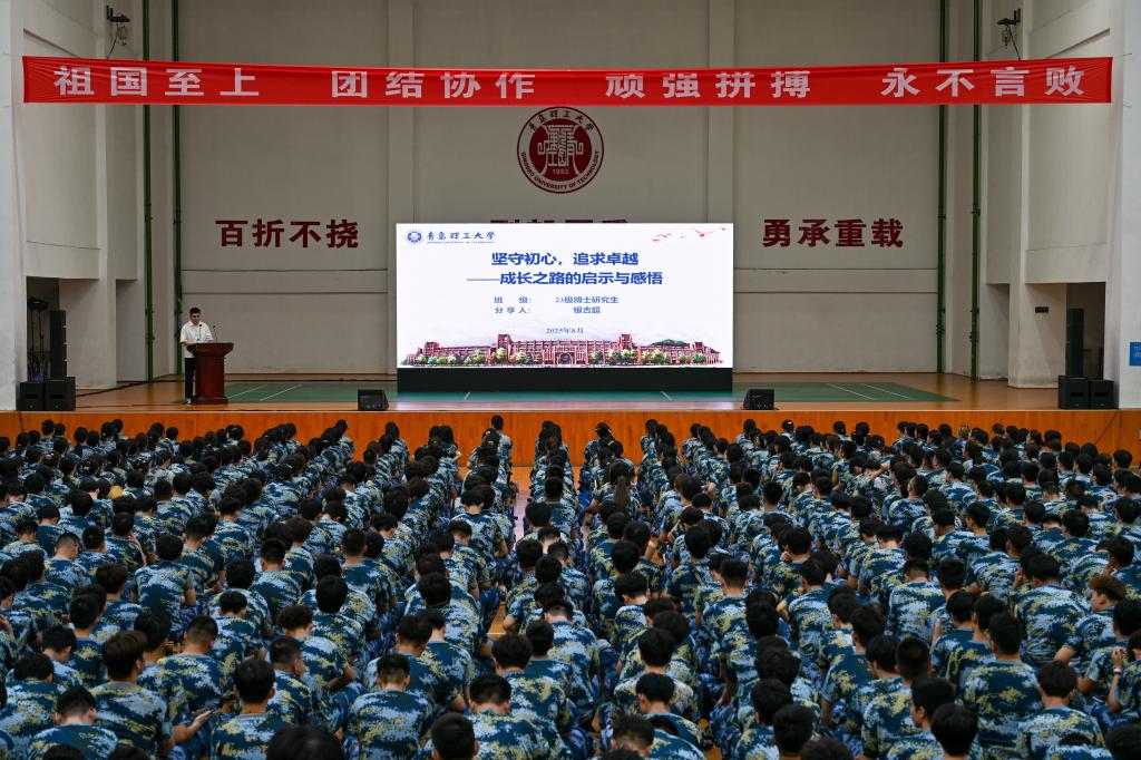 在优秀学生代表分享环节,2023级退役士兵薛淼结合自身成长经历,以“筑梦国防、青春无悔”为题展开交流。她特别提到:“大学是一场自主探索的旅程,唯有主动规划、勇于尝试,才能突破自我、不负韶华。”2023级博士研究生银吉超从本硕博三个阶段介绍自己与理工大的故事,结合学科竞赛、科研平台等方面,鼓励新生积极融入集体、锻炼综合能力。他们的真诚分享为初入校园的新同学提供了宝贵借鉴。