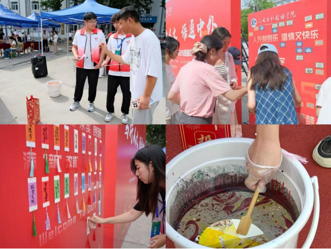 依托“笃行人文,语通中外”的院训精神,学院在迎新现场打造了一系列特色文化体验区,让新生沉浸式感受学科魅力与人文底蕴。“多语种祝福墙”前,新生们用中英日等语言写下对未来大学生活的期待与梦想,多彩的文字承载着多元文化的交融;“传统文化体验区”内,投壶游戏的欢笑声、漆扇绘制的专注神情,让新生们在传统非遗技艺中感受中华优秀传统文化的博大精深。“幸运刮刮乐”环节更是带来惊喜与欢乐,留下独属于大学生活的第一份记忆。
