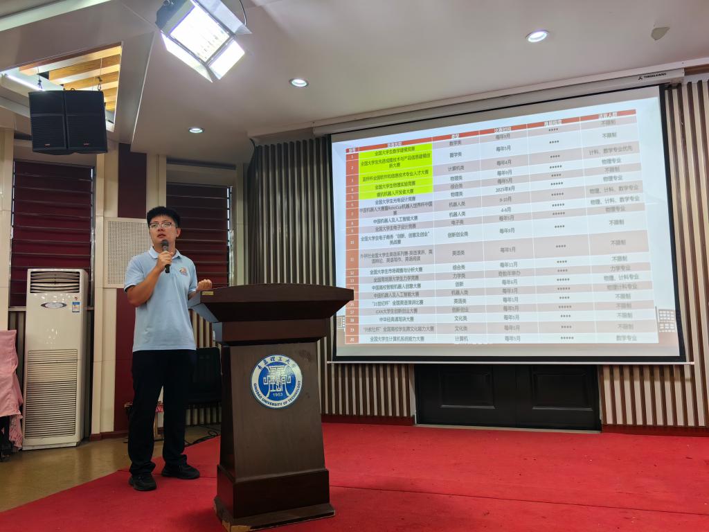 张文耕围绕学科竞赛与公寓管理展开讲解。他结合学院学科优势与往届竞赛成果,介绍了各类学科竞赛的参与方式,鼓励新生积极参加学科竞赛,提升专业素养与实践能力。同时,针对公寓管理,他详细解读学校相关规章制度,强调安全、卫生与作息规范,鼓励新生共同营造温馨和谐的宿舍氛围