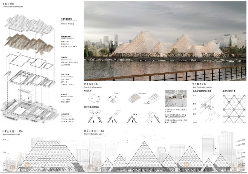 我院潘建成同学的作品以“摆渡人和他的故事”为题,提出“记忆重组”的设计概念,回应城市更新语境下人们对过往历史与场所精神的感知重构。设计从四类“记忆碎片”出发——正常记忆、关键记忆、可能记忆与遗忘记忆,运用“重组”逻辑进行空间语言转译。场地被理解为一个层层推进的记忆容器,观者在四章叙事中穿行——序章唤起、过章重构、续章生长、终章沉淀。空间序列引导观者在碎片、缝隙与交错中展开身体记忆的再书写,形成理性与感性交织的建筑体验,构建一个既承载过往又启发当下的文化地标。傅旭威同学的参赛作品以“走!去里院耍”为题,伙伴的一声吆喝,不仅是运动的邀约,更是老青岛邻里社交方式最质朴的呈现。在钢筋混凝土林立,公众活动场合受到挤压的今天,场馆摒弃了专业场馆的距离感与功利性,以一声邻里招呼般的亲切呼唤——“走!去”,宣告空间的绝对开放与零门槛,引导人们回到传统里院生活中的情感锚点,鼓励所有人即刻运动、轻松融入。 在这里,“院”不仅是三角柱廊围合出的物理院落,更是指向一种温情、包容、归属感的社区精神,回归最纯粹的生活享受与人际互动。