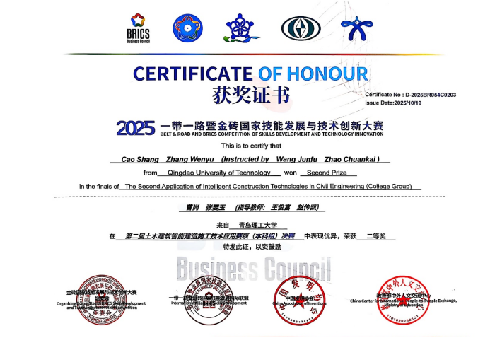 10月19日,2025“一带一路”暨金砖国家技能发展与技术创新大赛第二届土木建筑智能建造施工技术应用赛项落下帷幕。赛事系全国普通高校大学生竞赛排行榜目录内赛事,本届赛事吸引全国800余所院校、近6000名师生参与选拔,298支队伍入围决赛。经过激烈角逐,土木工程学院参赛队伍(曹尚、张雯玉;指导教师:赵传凯、王俊富)凭借其扎实的专业功底、出色的技术创新能力与稳定的现场发挥,获得全国二等奖,学校获评“优秀组织奖”。