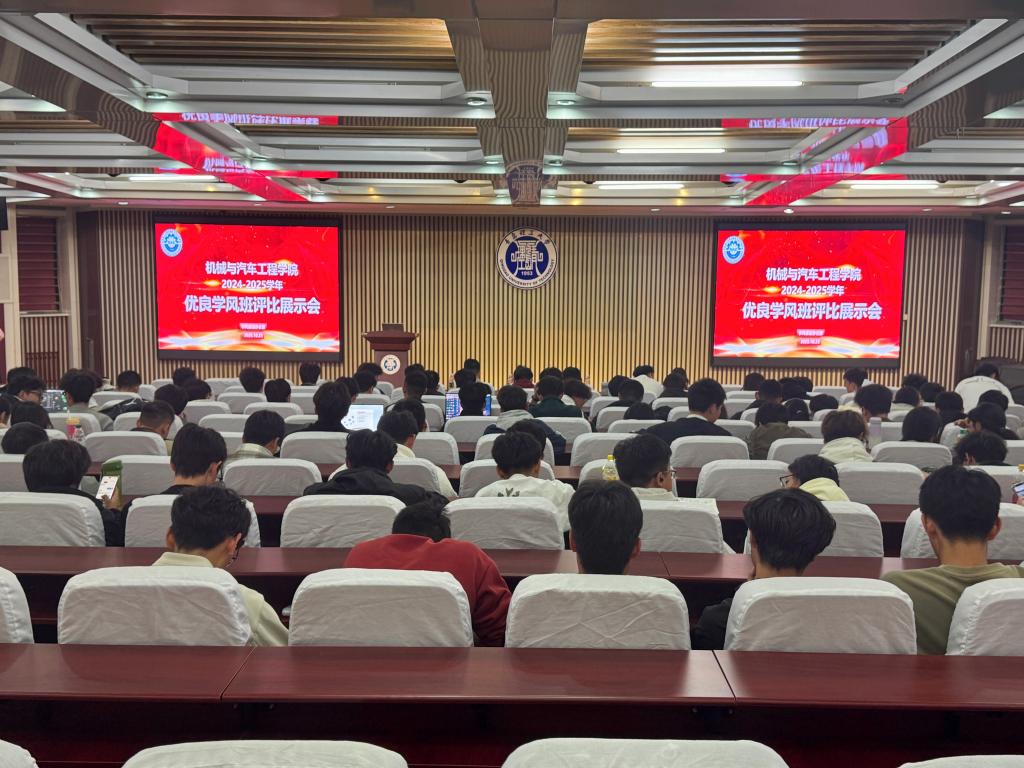 为进一步加强学院学风建设,展示优秀班级学风建设成果,有效引导学生形成良好的学风、班风,10月24日,机械与汽车工程学院在主教学楼东报告厅开展“优良学风班”评比展示活动。学院学工办主任、团委书记徐卫晓、学风建设办公室指导老师管廷晋、2025级辅导员甘洋龙、2024级辅导员吴琼出席并担任评委,各班级班长、团支书、学习委员观摩此次活动。