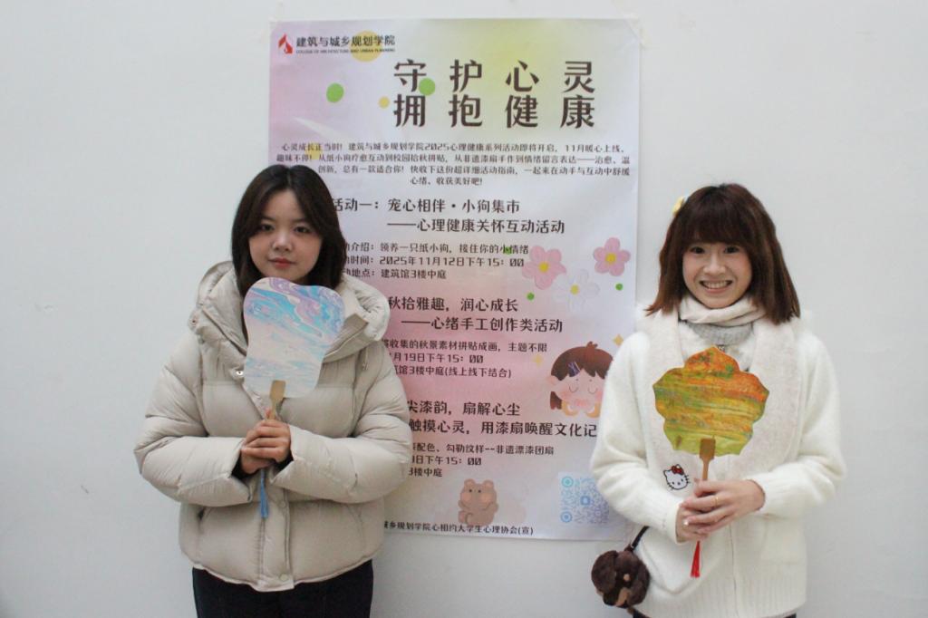 为进一步加强校园心理健康教育,培育学生积极心理品质,营造健康向上的校园文化氛围。建筑与城乡规划学院开展“守护心灵 拥抱健康”心理文化节系列活动。本次活动围绕心理关怀、手工创作、非遗体验等多个主题展开,助力学生以更饱满的心态面对学习与生活。