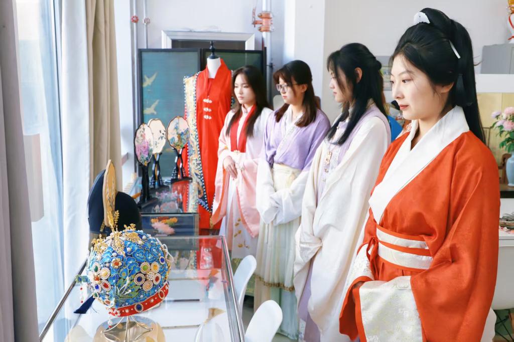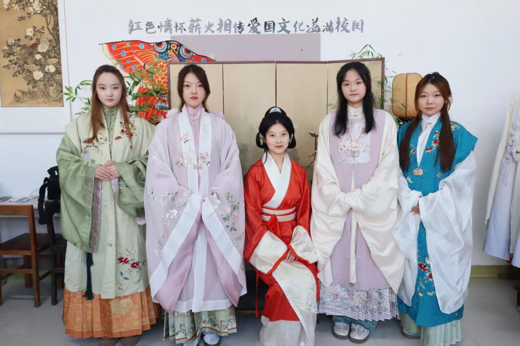 活动现场,学生社区被精心布置为沉浸式国风空间,从战国袍、曲裾、交领襦裙到坦领半袖衫、马面裙,数十套形制规范的汉服整齐陈列,志愿者为同学们提供服饰穿戴指导与形制科普,解析服饰背后的伦理内涵与文化象征,让体验不止于“颜值”,更深入“内涵”。“这不仅是穿一件衣服,更是了解古人的生活美学。”正在学习盘发技巧的同学表示,社区搭建的近距离体验平台,让传统文化不再是书本上的文字。