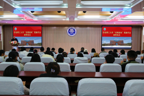 11月26日,青岛理工大学首届“青理清风”奖助学金颁发仪式在黄岛校区主教学楼一楼东报告厅举行。校纪委、学生工作处、合作发展处、校工会(妇委会)、校团委等相关部门负责同志、人文与外国语学院领导班子成员出席仪式。“青理清风”奖助学金获得者和人文与外国语学院网络与新媒体专业各年级学生代表100余人参加会议,市北校区学生线上参会。颁发仪式由人文与外国语学院党委书记王粲主持。