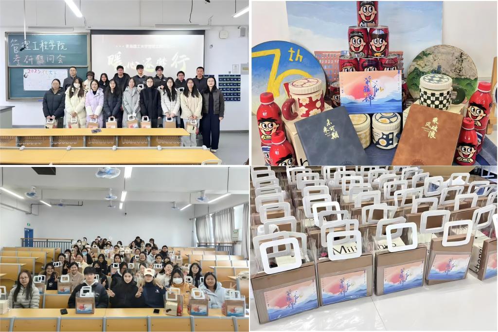 暖心礼包,研梦启航。学院考研慰问大会于26日上午在2教302教室举行,副书记柳志广结合往年经验,为学子们送上冲刺阶段的“备考锦囊”,希望大家以沉稳之心应对压力,以科学方法攻克难点。随后与2022级辅导员一同为备战学子送上寓意深远的暖心礼包——“旺气冲天”旺仔牛奶传递满满活力,“暖心相伴”马克杯承载冬日温情,“乘风破浪”精美笔记本记录备考点滴,“前程似锦”加油贺卡写满殷切期许。一份份礼包不仅是物质上的支持,更凝聚着学院的深切关怀,让冬日里的备考之路暖意融融。