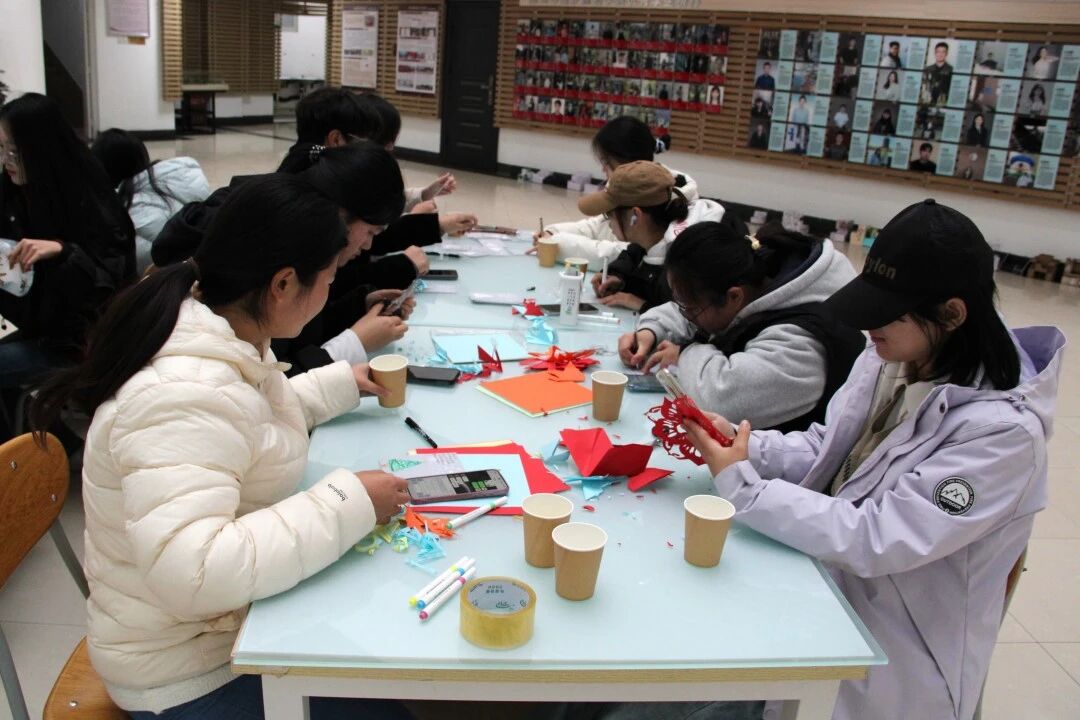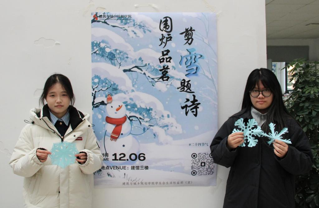 活动围绕“大雪”节气的物候特征与文化寓意,设计了一系列沉浸式体验环节,整合了“围炉煮暖茶”“雪花剪纸”与“大雪·留白诗会”三大体验板块,营造出浓厚的传统文化氛围。在“围炉煮暖茶”区域,同学们亲手烹煮桂圆红枣茶、生姜红糖饮等应季热饮,围坐交流,在茶香袅袅中体味“冬藏”养生智慧与传统民俗中“围炉共话”的温馨意境;“雪花剪纸”区则展现出红纸翻飞、巧手裁冬的热闹场景,参与者以剪纸为语言,创作出寓意“瑞雪丰年”“五谷满仓”的雪花、麦穗与粮囤图案,在动手实践中传递对岁物丰成的美好祈愿;“大雪·留白诗会”以雪花形诗卡为载体,提供“屋檐”“初雪”“归人”等冬日意象词,参与同学们即兴提笔、联句成诗,在共同创作中完成了一场充满诗意与共鸣的集体表达,让传统文化在笔墨交织间焕发新生。