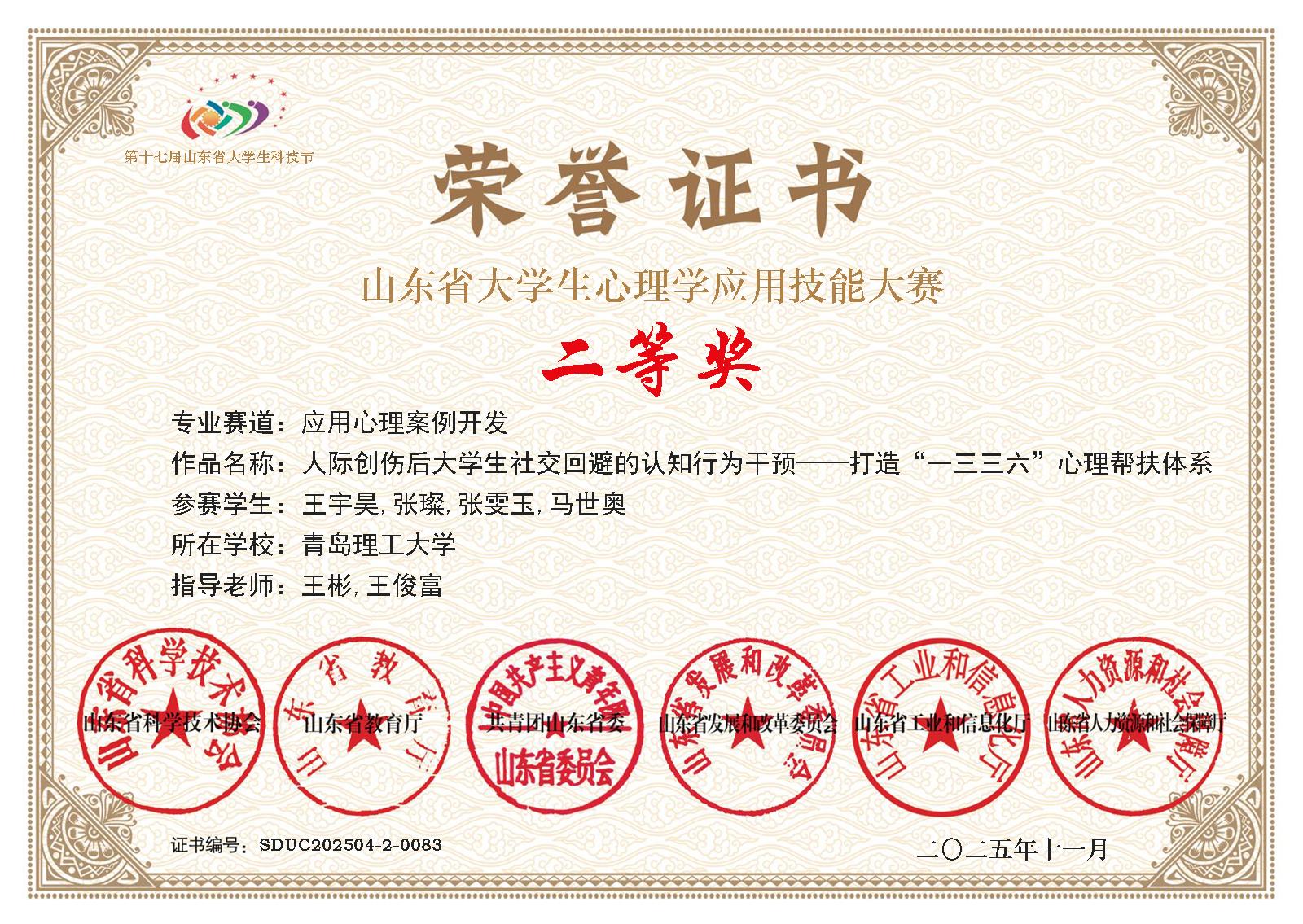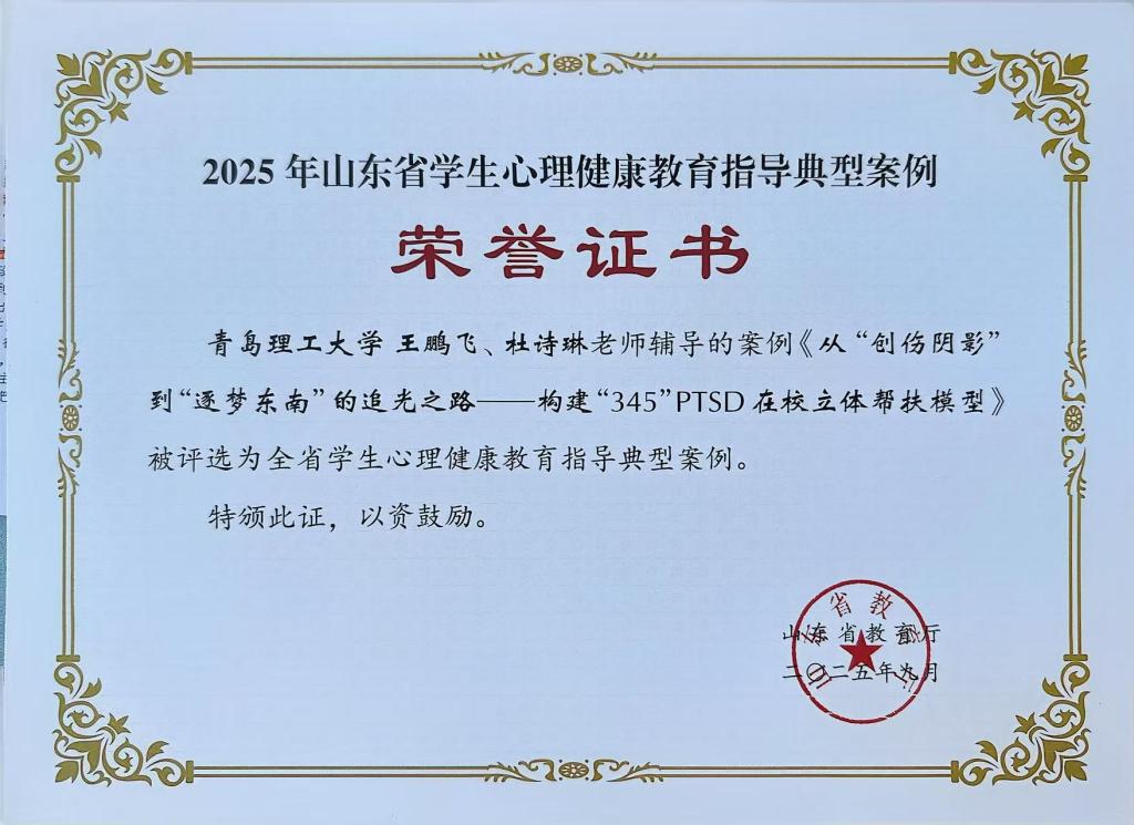 学院积极搭建“实践体验+专业指导+赛事赋能”的心理育人体系,涌现出一大批优秀心理作品。在第十七届山东省大学生科技节大学生心理学应用技能大赛中,学院斩获二等奖2项、三等奖7项;“雪绒花”微爱行动荣获青岛市心理健康宣传教育月特色活动三等奖;学院申报的两份心理工作案例分别荣获山东省学生心理健康教育指导典型案例、青岛市大中小学学生心理健康教育指导典型案例二等奖,用扎实的实践成果彰显了学院心理育人的显著成效。