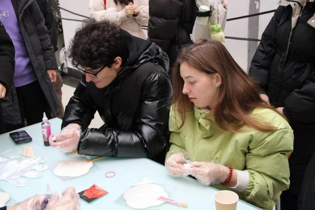 扎染区前,中外学子在工作人员指导下沉浸式学习扎、捆、绑、染技艺。大家专注地将洁白棉布折成方块、拧成麻花或扎出褶皱,用皮筋固定出创意造型后,小心翼翼浸入靛蓝染缸。学子们围坐畅谈,分享各自国家的传统手工艺,欢声笑语中拉近了距离。当解开皮筋,素净棉布绽放出独一无二的花纹时,留学生们举着作品用中文赞叹“太漂亮了”,并与中国同学合影,现场氛围迎来首个高潮。漆扇、剪纸体验区同样人气高涨,漆扇区里,素白扇面、多彩漆料整齐排列,志愿者详解刷漆、绘画等工序后,学子们提笔创作。留学生临摹简单的传统纹样,融入本国文化元素,中国学生主动上前指导调色勾线,一幅幅作品相继诞生,中外学子携手创作,共同感受传统技艺的匠心。此外,茶台区别有韵味,中外学子品茗畅谈,在醇厚甘甜中体会中华茶文化的底蕴,宁静氛围与其他区域的热闹形成互补,尽显文化多元魅力。