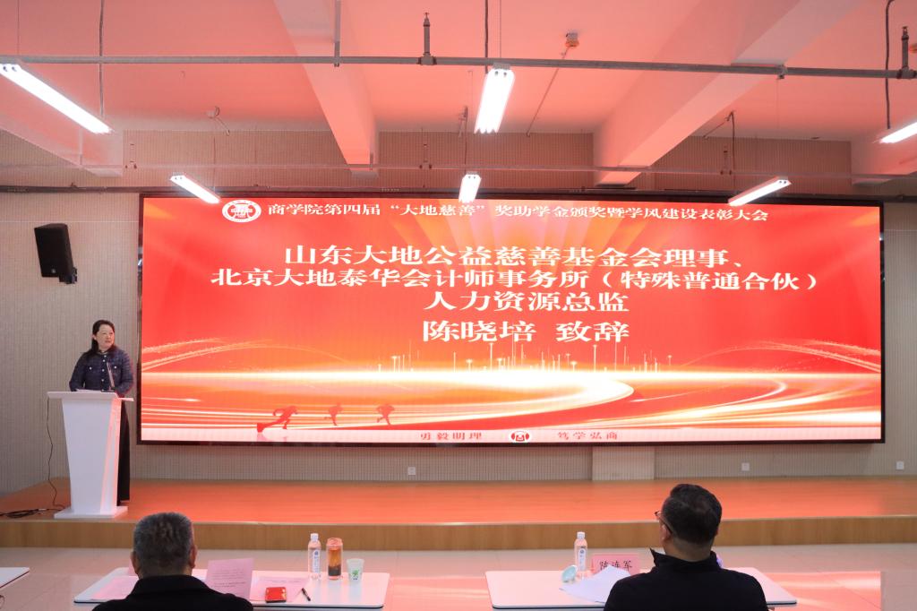 山东大地公益慈善基金会理事、北京大地泰华会计师事务所(特殊普通合伙)人力资源总监陈晓培在致辞中表达了对学校教育事业的支持,强调基金会将继续搭建校企合作与校友反哺平台,助力学子成长成才;并勉励受表彰学生珍惜荣誉,努力以专业能力回馈社会,传承爱心与责任。