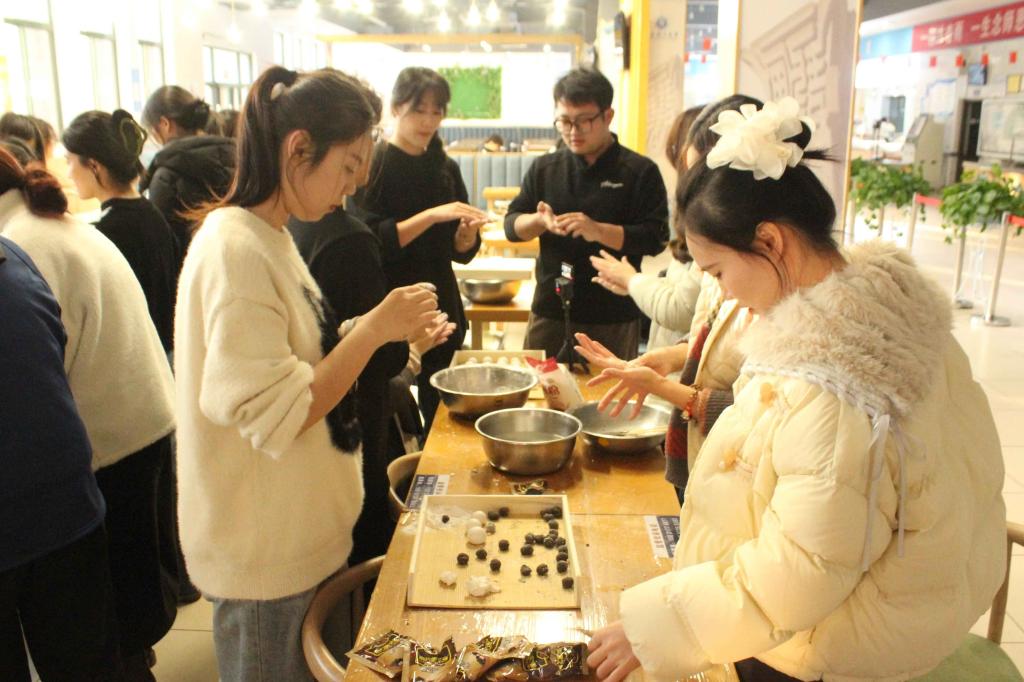 在包汤圆区域,学生负责人首先为同学们讲解了冬至的民俗文化内涵,随后进行汤圆制作示范,从和面、搓馅到成形,细致讲解技巧与要领。同学们专注聆听,跃跃欲试,南北方学子互相分享着家乡的冬至习俗。在实践环节,大家分组协作,揉粉、包馅、搓圆,虽手法生疏却充满热情,现场笑语盈盈,暖意融融。不一会儿,一颗颗雪白滚圆的汤圆在指间诞生,摆满了餐盘,在“圆”与“饺”的对话中,加深了对传统文化的理解。