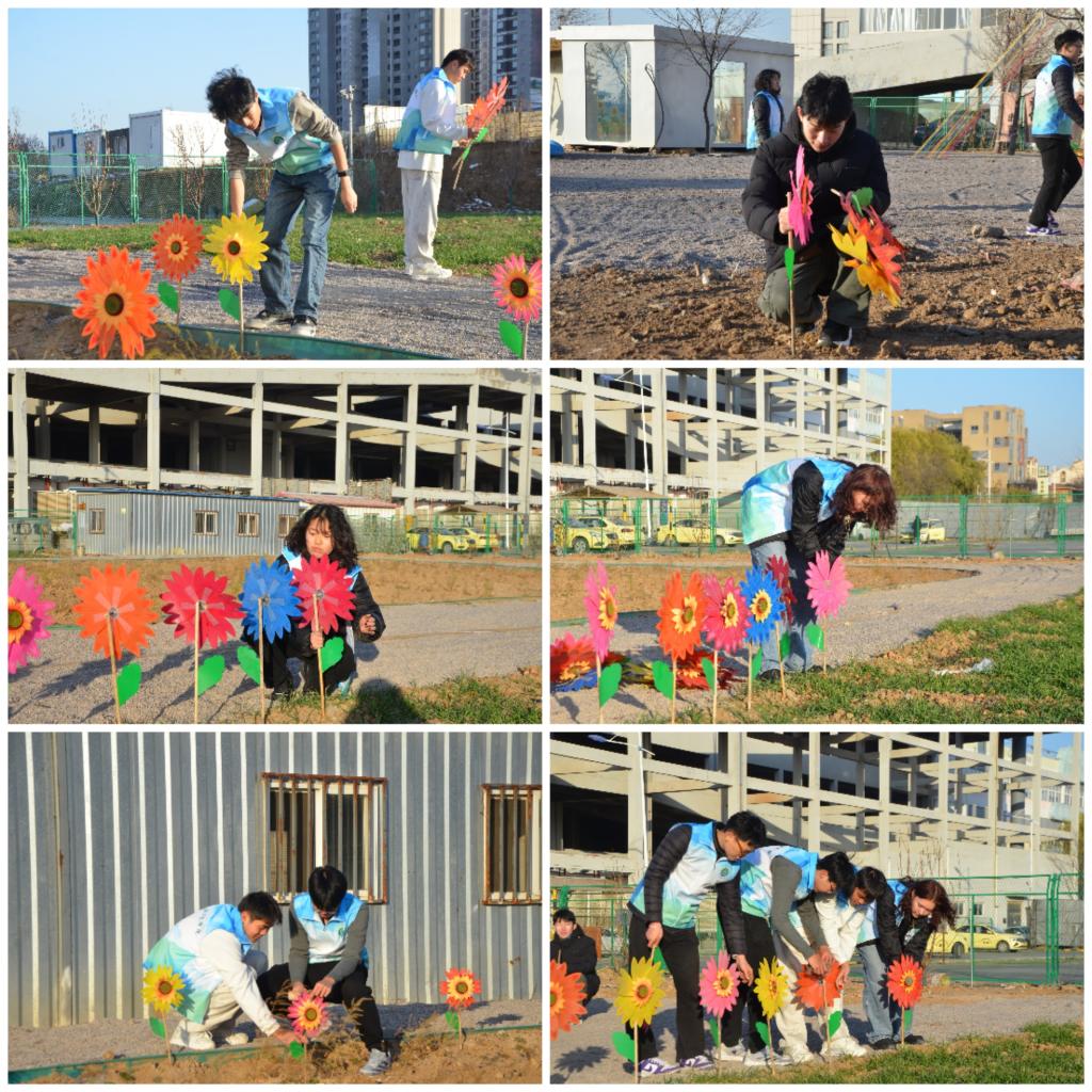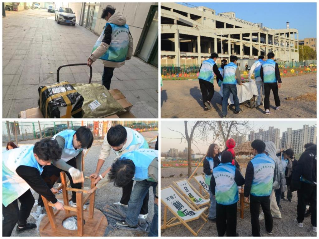 活动现场,志愿者们分工明确、干劲十足。从中午开始,大家穿梭在农场的各个角落,将五彩斑斓的小风车逐一插在田埂与围栏边,微风拂过,风车簌簌转动,为静谧的农场增添了灵动的色彩。与此同时,另一批志愿者则专注于木材、桌子的组装工作,他们仔细对照图纸,默契配合,将一根根木材拼接稳固,一张张桌子搭建成型。还有志愿者主动承担起挂画布置与快递领取的任务,细心将充满童趣的挂画装点在农场的休息区,让农场的环境更显温馨。