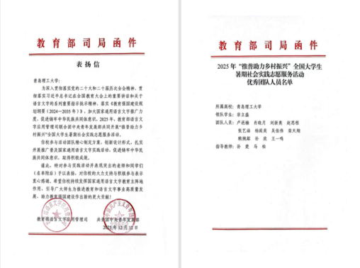 近日,教育部语言文字应用管理司、共青团中央青年发展部联合向青岛理工大学商学院发来表扬信,对商学院“推普助力乡村振兴”实践团在2025年全国大学生暑期社会实践志愿服务活动中的突出表现予以表扬。