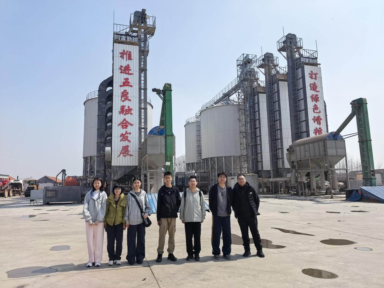 大场镇党委宣传统战委员孙薛亲切接待了到访师生,双方围绕基地后续发展、文旅深度融合等主题进行现场交流。孙薛表示将支持2026届毕业生依托该区域开展毕业课题研究,推动产学互动与实践育人走向深入。随后,师生一行走进现代粮食产业基地,实地参观了粮食晾晒烘干塔、现代农业生产机械等设施,现场了解万亩绿色增粮示范区建设发展情况。通过近距离接触,同学们深刻体会到科技赋能农业、产业振兴对激活乡村全面振兴的重要意义,对“藏粮于地、藏粮于技”战略及乡村振兴的时代内涵有了更直观的认知。