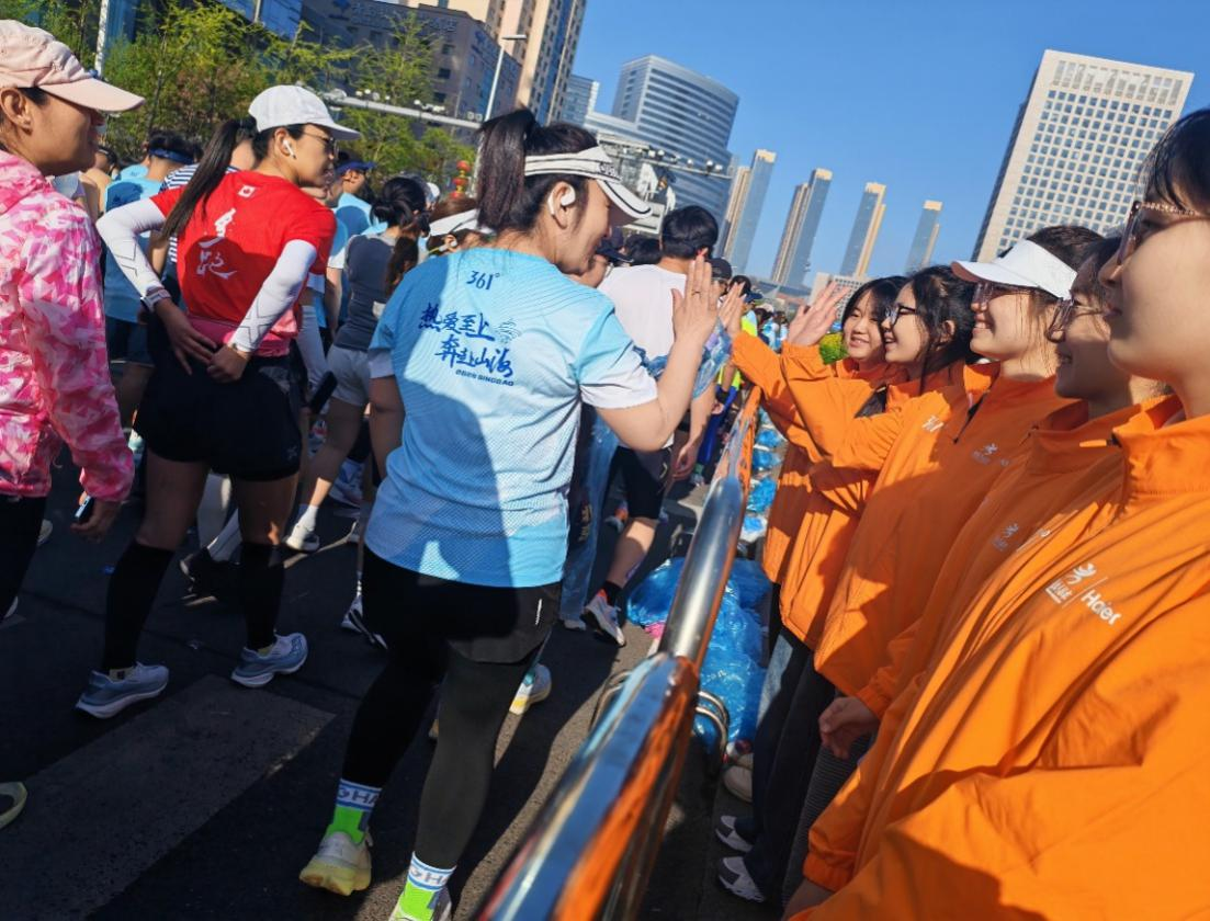 2026年4月19日,青岛马拉松在春日晨曦中鸣枪开跑。人文与外国语学院44名志愿者积极参与赛事志愿服务工作,分别在起点检录区、5公里及7.5公里赛道补给站提供保障,以饱满热情、细致服务为赛事保驾护航,成为赛道旁一道靓丽的青春风景线。