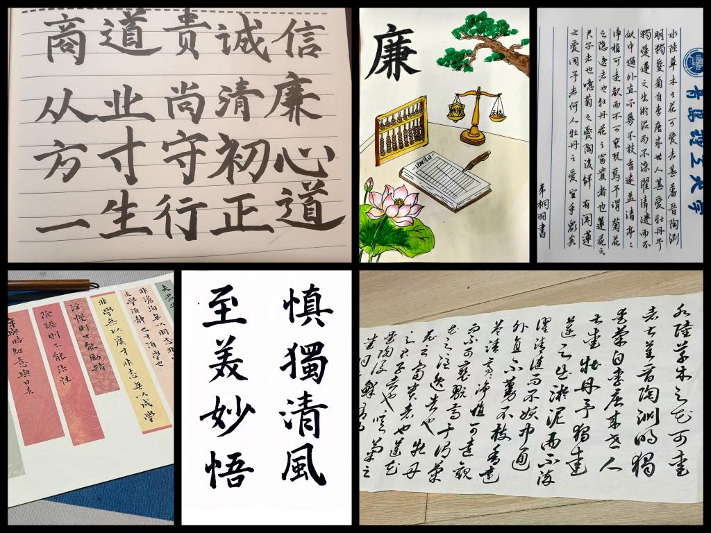阅悟清廉,笔绘初心。学院将阅读学习与廉洁文化建设紧密结合,开展“廉洁铸魂,清廉商学”主题征文暨书画创作比赛。学生在研读廉洁经典文章的过程中,以潘序伦先生等廉洁榜样为引,创作《以商科之廉,守职业之正》等优秀征文,深刻诠释商科人的职业底线与诚信初心;通过《爱莲说》行书、“商道重诚信”楷书等作品,生动传递崇廉尚洁、诚信为本的价值追求。学生在阅读与创作中树立严谨诚信的价值理念,让清廉之风浸润校园。