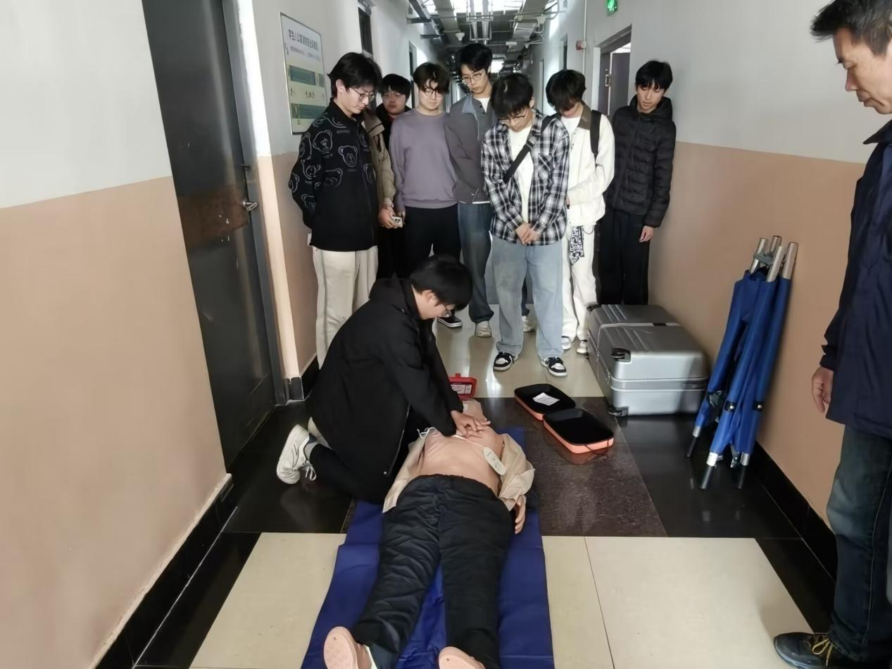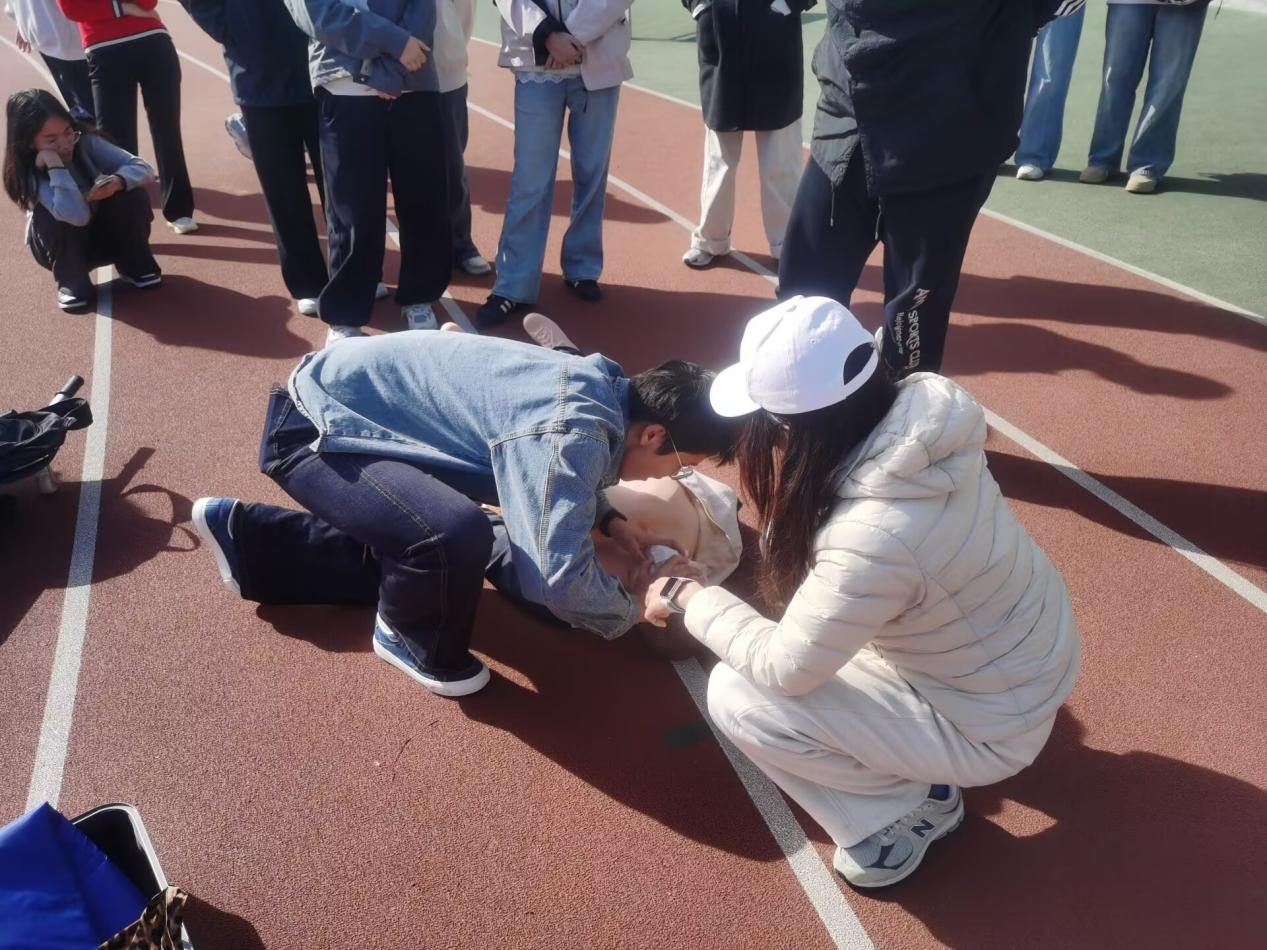 实操体验环节在西操场、学生宿舍两大场景同步开展。活动采用情景演绎形式,模拟校园突发心跳骤停真实场景,学生代表分组上手操作,在校医院医生指导下完成心肺复苏、AED使用等实操训练,把理论知识快速转化为实用技能。