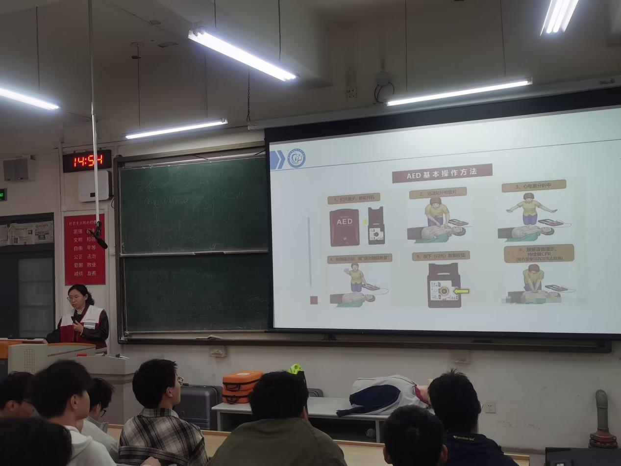 随后急诊医学科副主任医师杨彦萍接续开展心肺复苏与AED使用专题讲座,详细讲解心脏骤停识别、“黄金4分钟”急救原则,现场演示胸外按压、开放气道、人工呼吸及AED操作步骤,拆解关键动作要点,让同学们清晰掌握急救理论与规范流程。