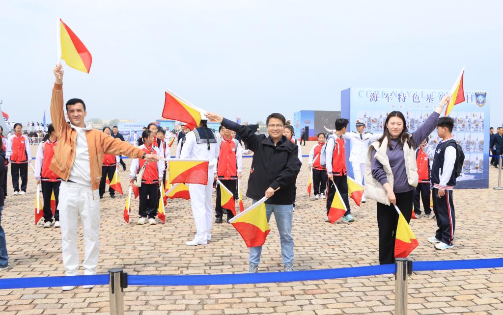 4月21日,商学院党委书记肖学斌、学校学生工作处(武装部)正科级干部季献涛、商学院辅导员于淼和艾子彤、退伍大学生士兵、学生党员代表走上青岛港三号码头齐齐哈尔舰、芜湖舰、东平湖舰、阳澄湖舰四艘功勋舰艇,在海军官兵引导下,师生登临国产新型舰艇,零距离感受人民海军现代化建设的崭新成就,聆听舰艇执行远洋护航、战备巡逻等重大任务的强军故事。活动创新设计的“海军手旗旗语”、海军应急服装体验等实践课堂引发同学们的兴趣。师生们在专业教员指导下,以红白双旗为“笔”,海天为“纸”,精准传递“海军节”“向海图强”等短语,用肢体语言破译深蓝征途的“摩斯密码”。