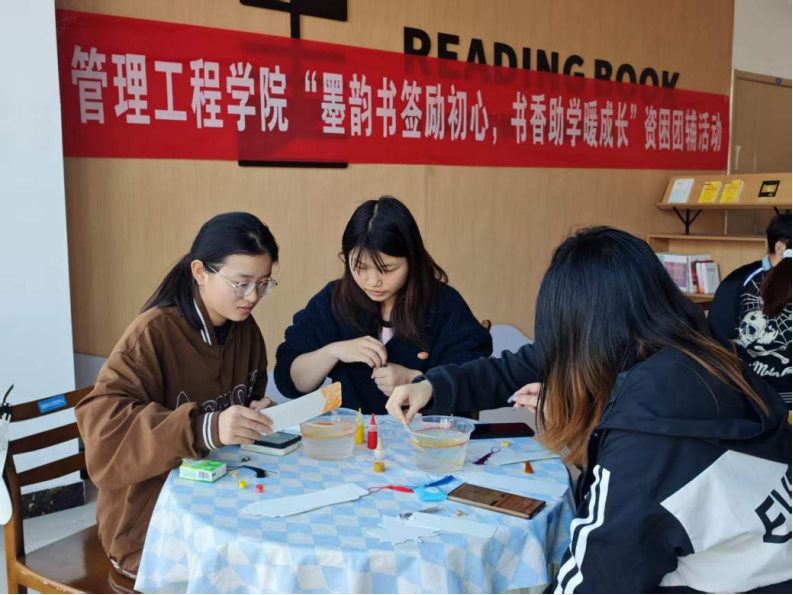 为积极响应学校书香校园建设号召,扎实推进资助育人工作走深走实,充分发挥资助育人实效,4月23日,管理工程学院在学院楼四楼读书角组织开展“墨韵书签励初心,书香助学暖成长”资困团辅活动,学院30余名家庭经济困难学生参加。