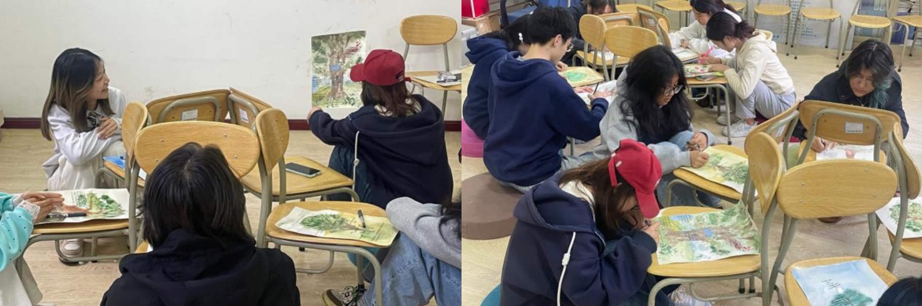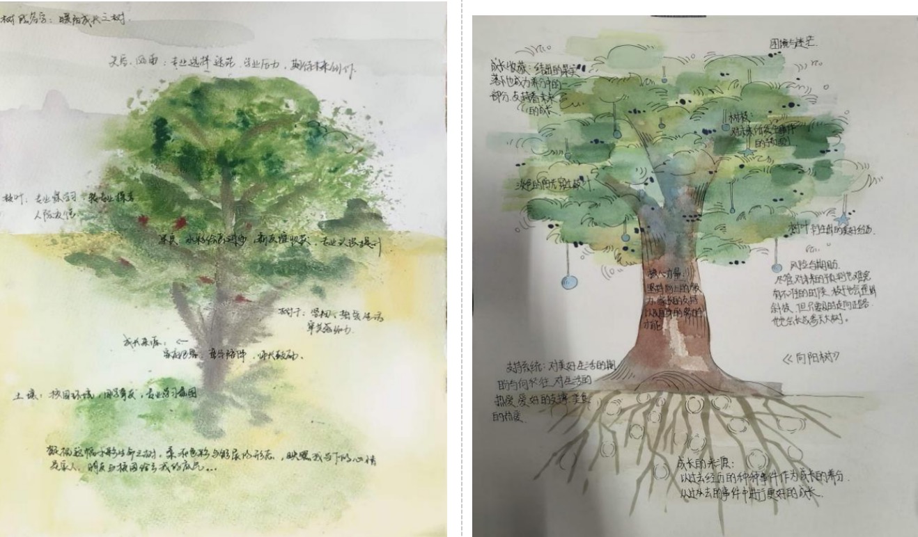 艺术创作阶段,现场播放舒缓音乐,同学们沉浸于沉浸式创作中,用水彩、彩铅等多元形式,勾勒出一幅幅风格各异、饱含心意的专属“生命之树”。大家将家庭滋养、性格优势、学业困惑、成长喜悦尽数融入画作,为自己的树写下注解、标注寓意,在笔尖流转间完成情绪释放与自我梳理。