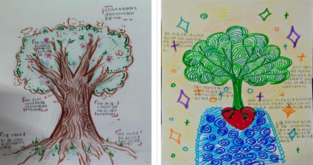 随后的深度对话环节,同学们凝视着自己亲手绘制的“生命之树”,向内探索成长经历、内在力量与未来期许,以小组形式自愿分享创作背后的故事。同学们细数树根承载的家人陪伴、童年温暖,讲述树干凝聚的自身勇气、性格优势,畅谈枝叶间藏着的学业挑战、生活感悟,在彼此的倾听与共情中,消解孤独感、汲取同伴力量,建立起温暖的互助联结。