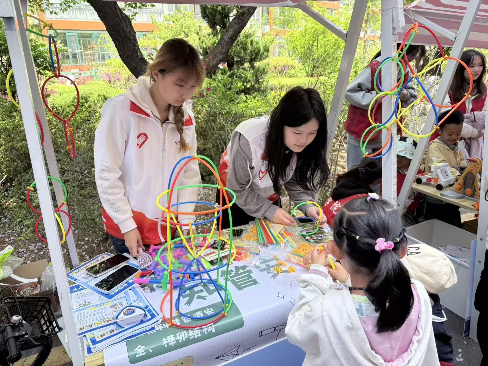 专业赋能科普,筑牢安全防线,践行学科服务使命。活动紧扣建筑学科核心知识,设置管道安全科普与榫卯文化体验两大板块,实现“专业知识通俗化、实践体验趣味化”。在管道安全科普环节,志愿者结合给排水、燃气管道规划与建筑构造专业知识,用通俗易懂的语言,向社区儿童讲解管道功能、安全规范及风险防范要点,引导青少年树立“远离危险管线、守护居家安全”的意识。为强化认知,志愿者带领孩子们开展立体管道拼插实践,以吸管模拟城市管网布局,直观呈现管道走向、连接逻辑与空间排布原理,让抽象的工程知识转化为可感知、可操作的实践体验,提升儿童安全素养,展现建筑学科在城市基础设施安全领域的专业支撑作用。同时,志愿者面向社区居民开展管道安全专项宣讲,围绕管道老化、私改乱接、堵塞渗漏等常见隐患,普及居家防护要点,发放安全宣传资料,推动“人人参与、共筑安全”理念深入人心。