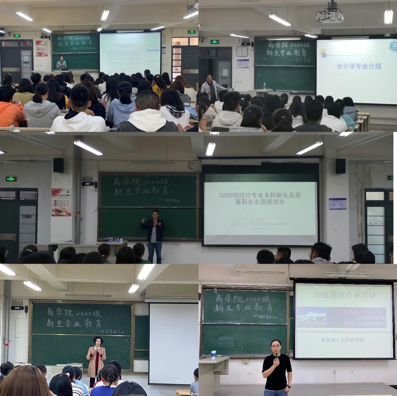 为使2020级新生进一步了解所学专业,合理规划学业,明确学习目标,10月7日,商学院在主教学楼分别召开会计、财管、经贸、统计和国商等专业新生专业教育讲座。讲座由刘奕、孙照、臧瑶瑶等辅导员分头主持,王先鹿、夏秀芳、李娟娟、沈亮、孙秀明等各专业教研室主任担任主讲,各专业全体新生参加本专业讲座。