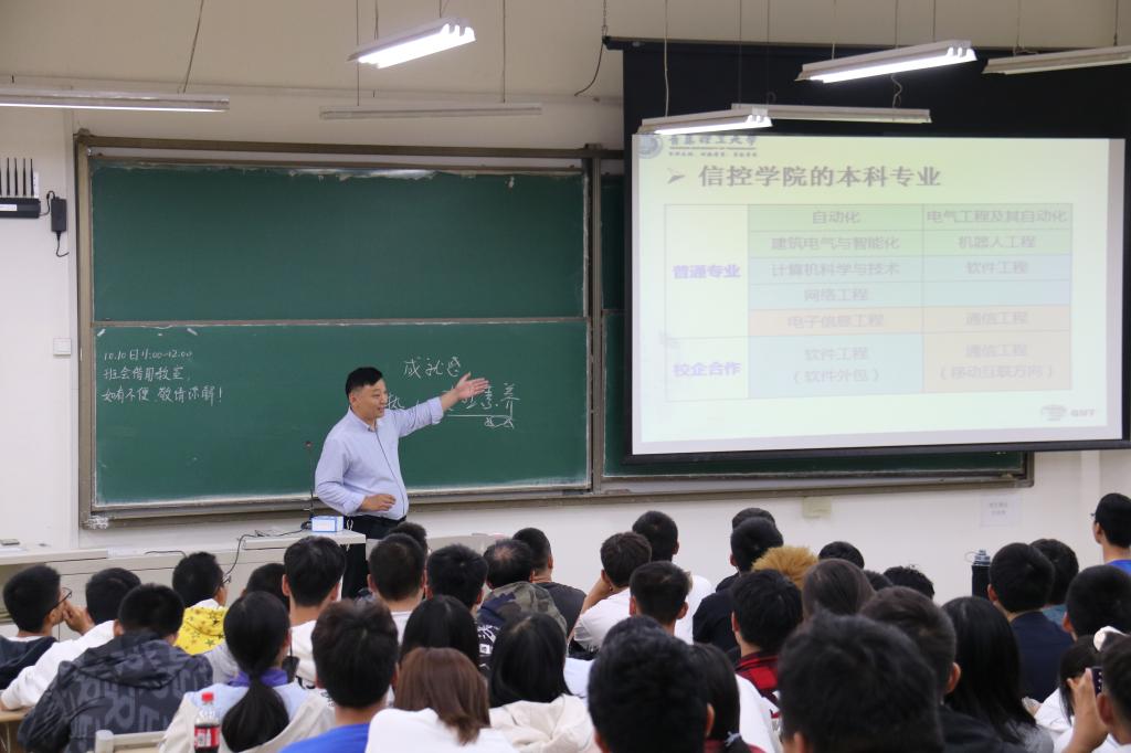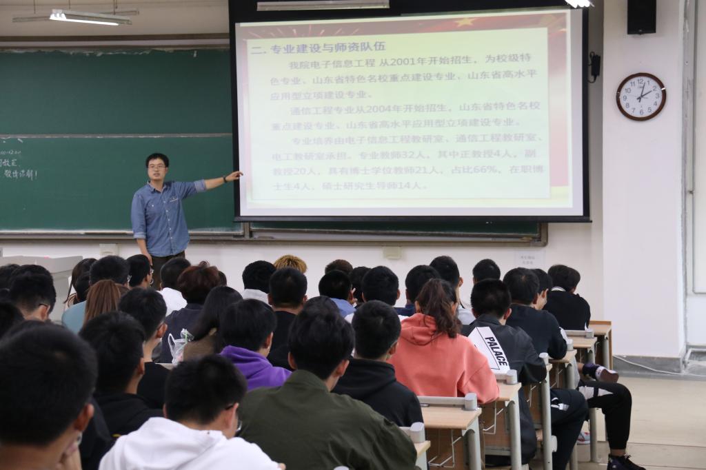 为帮助学生适应大学生活,坚定专业思想,养成良好的学习风尚,信息与控制工程学院通信工程教研室、电子信息工程教研室联合英谷教育,就专业培养、职业规划、学生管理等,面向239位新生,在嘉陵江路校区主教学楼B333和B335分两个会场开展专业大会教育。英谷教育王万琦,通信工程教研室主任王绪虎,专业教师禚钊、周立俭,辅导员孙海英参加大会。