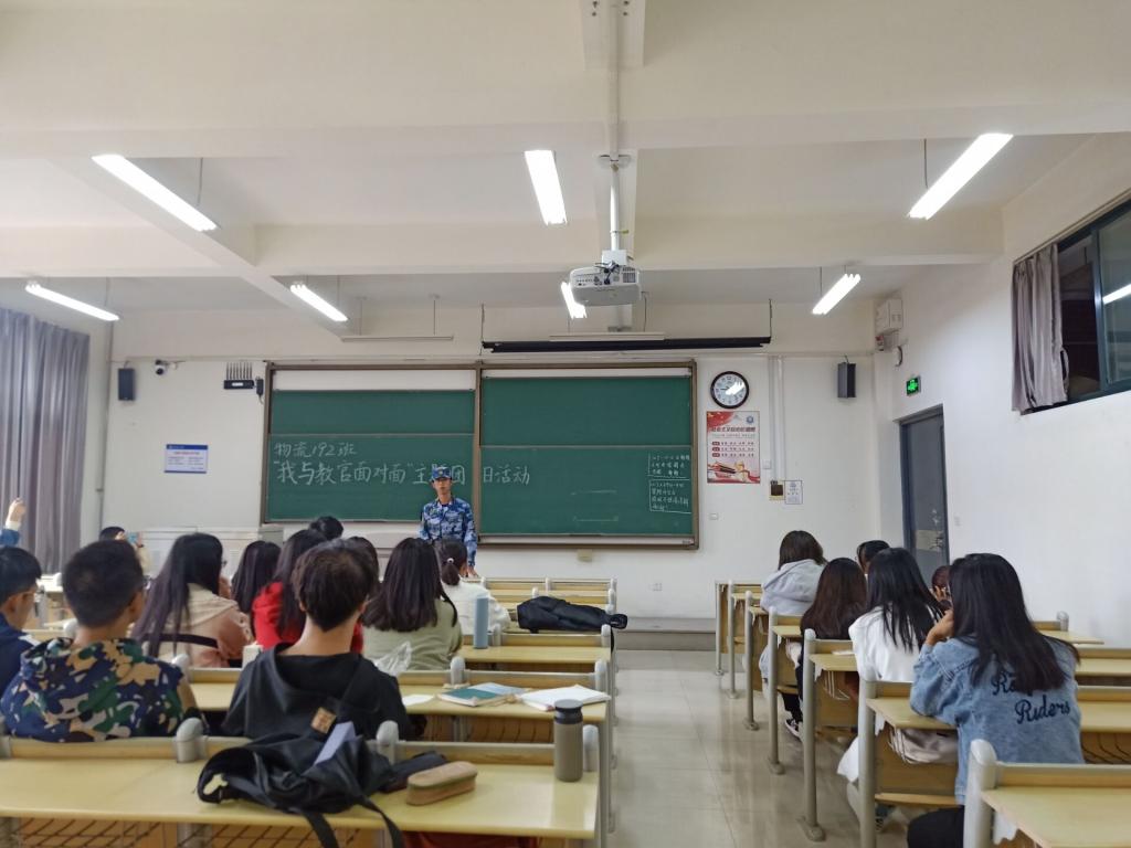 管科199和物流192团支部在教学楼共同开展了“我与教官面对面”主题团日活动。活动中张泽琛教官说:宝剑锋从磨砺出,梅花香自苦寒来。作为一名军训教官,他感到无比的荣幸与自豪。因为这是一次可以真正锻炼自己和认识自己、领悟到军训的内涵与真谛,体会作为军人的魅力与精彩的机会。身为一名教官,看着大家的动作、训练逐渐整齐,我很开心。看到大家坚定的步伐和灿烂的笑容,我很高兴。军训期间,我享受积极投入的状态,并感到无比的快乐,认真做动作示范,一遍一遍的带队训练。虽然没有多少休息的时间,但是觉得时间过得很充实!