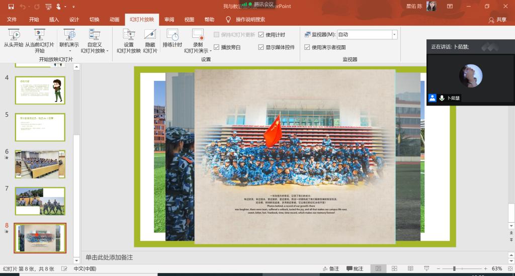 10月3日晚,管理工程学院召开主题团日活动布置会,以腾讯会议为载体。会议由管理工程学院分团委书记、学工办主任陈永亮老师主持,分团委成员周晓嵩进行会议记录,各团支部全体团员参加会议。会议开始,陈老师对此次团日活动以及今年的军训形式进行了简单介绍,随后播放2020年教官团电子相册,同时邀请教官团成员卜茹慧、周欢等教官从教官的选拔、备训情况、主要工作、典型事迹四个方面进行了详细地介绍。最后是互动环节,以此更好地了解、领悟教官的心路历程。通过卜茹慧同学的讲解引起支部所有人对军训教官团的向往,也让大家深深体会到了军训教官团光荣背后的辛酸与艰苦,学习教官勇于担当、乐于奉献、吃苦耐劳、勤于实践的精神和品质。