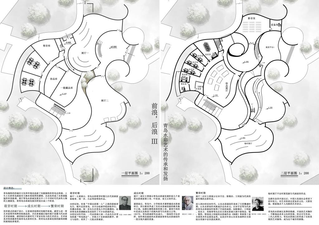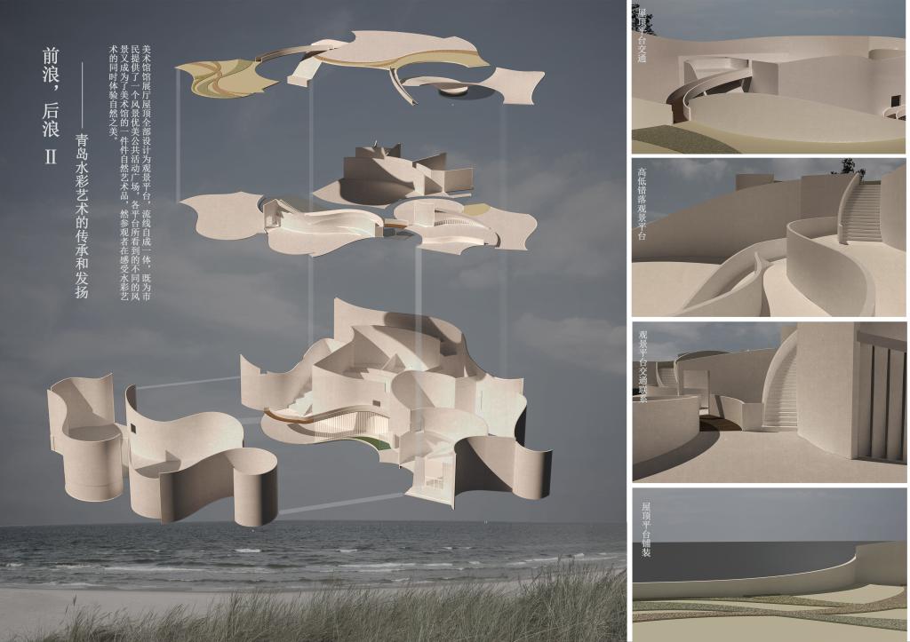 城规181班孙菲的美术馆设计作品《前浪,后浪》以“前浪后浪”为主题,贯穿建筑造型、内部空间、展陈设想、室内外流线组织。以浪花为造型,展现滨海建筑特色,与远处花瓣造型的青岛城市规划展览馆、近处弧线形的青岛雕塑馆相得益彰,形成雕塑园海滨建筑系列。
