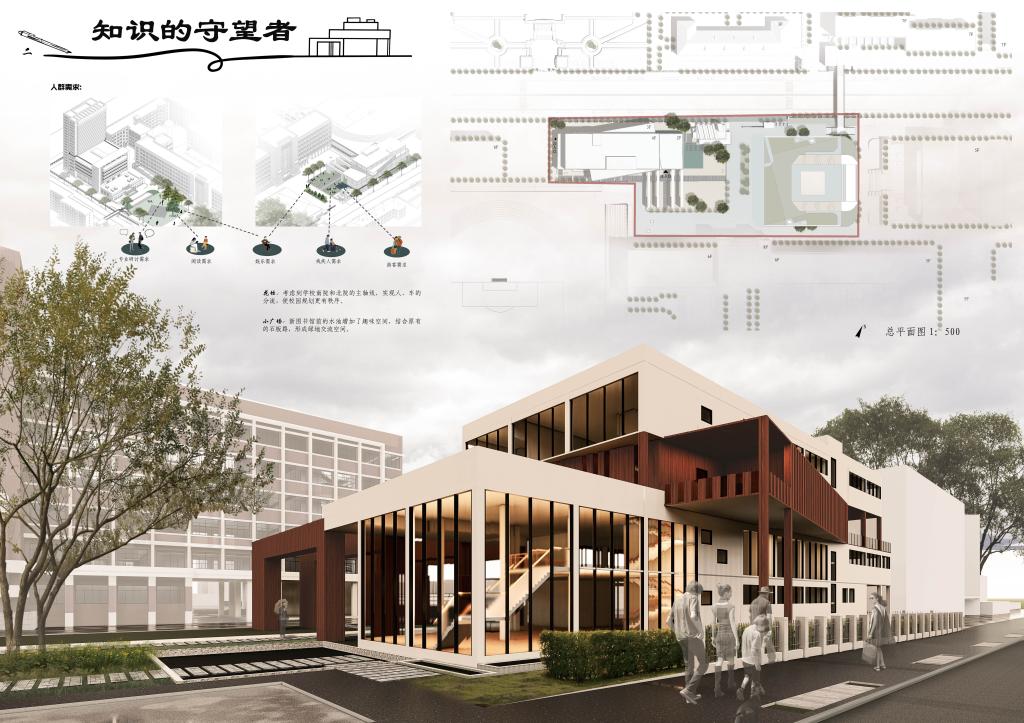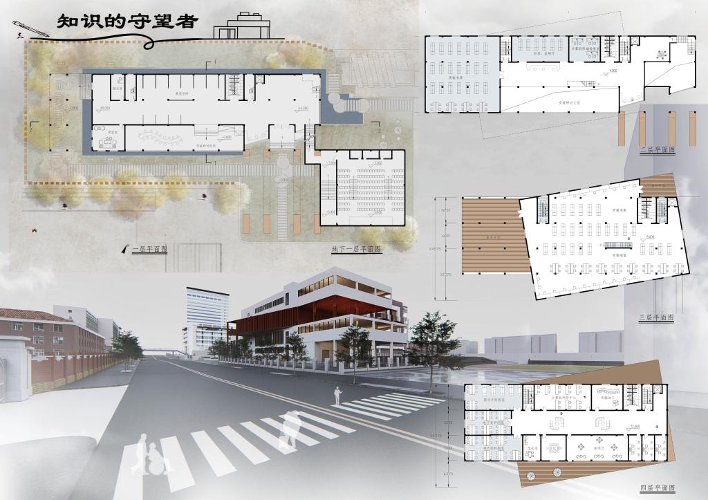 城规181班杨柏仪的图书馆设计作品《知识的守望者》以共享为起点,拆掉围墙,对外开放。广场以保留原有大树为原则,结合场地轴线、城市人流进行设计,对原有的台阶进行了拓宽与切割,周边形成了户外景观教室,为各个年龄段的孩子提供一处室外学习空间。图书馆如同一位站在高处的守望者,识惠着这座城市。