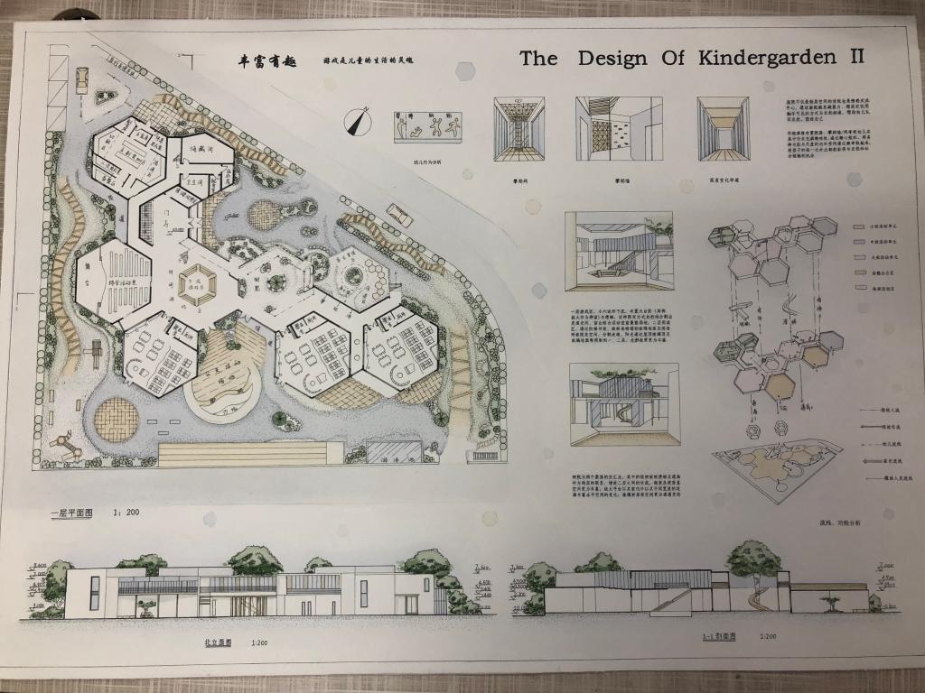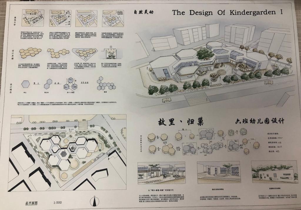 城规181班于子涵的六班幼儿园设计作品《故里•归巢》引入“小聚落”的概念,类比“聚落——个户+连接体+公共活动场地”采用“小聚落——班级单元+院落/廊+外部活动场地”的模式,引用蜂巢及六边形的形式,每三个六边形形成一个小聚落,三个小聚落通过枢纽门厅及庭院连接起来,旨在为幼儿提供安全亲切、丰富有趣、灵动自然的场所。