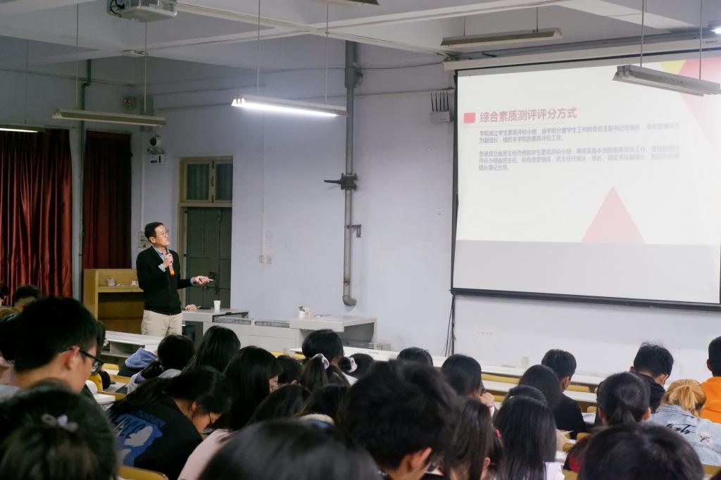 同时,王鹏飞对综合素质评价办法进行了详细的解读,介绍了综合素质测评的重要性,强调了在大学生活中应注意“德智体美劳”全面发展。同时他还向同学们讲解了相关扣分标准,叮嘱同学们在学习生活中需要提高自觉性和纪律性。