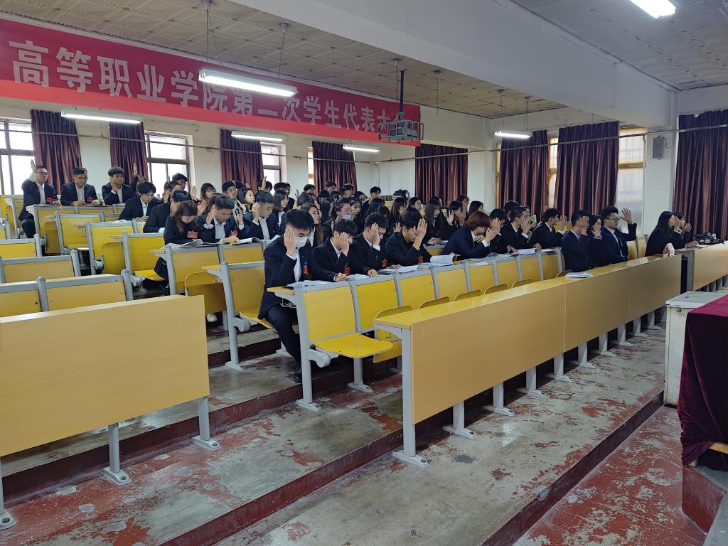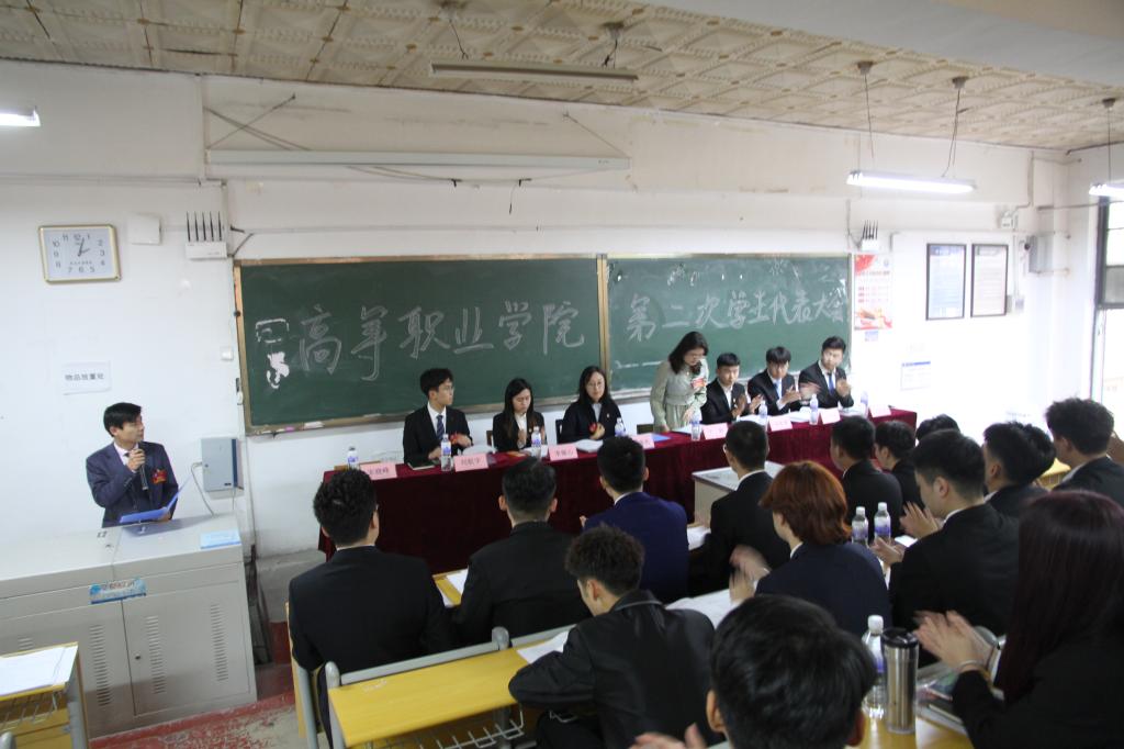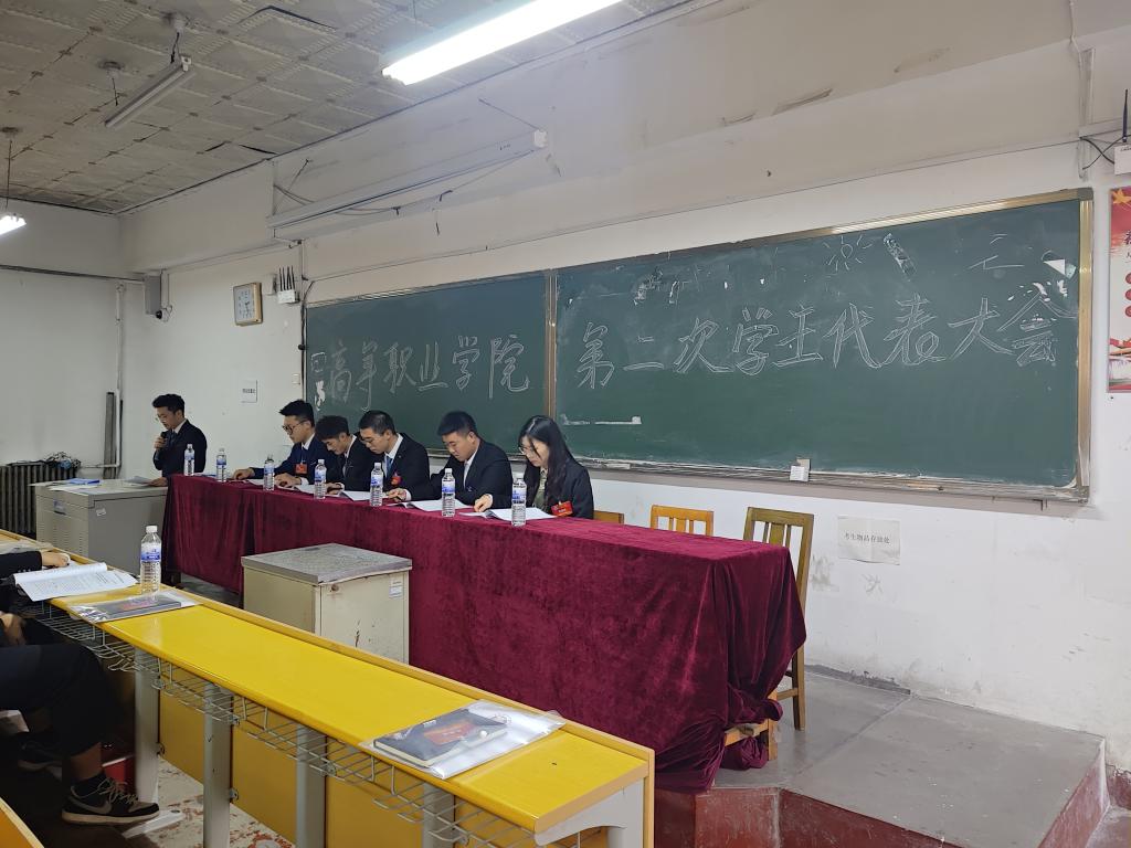 10月30日,高等职业学院第二次学生代表大会在市北校区三阶南教室胜利召开。学院党总支副书记范晓光,分团委书记宋晓峰,辅导员于璐,校学生会和市北校区各兄弟学院学生会的代表,以及全院65名学生代表共同出席了开幕式。