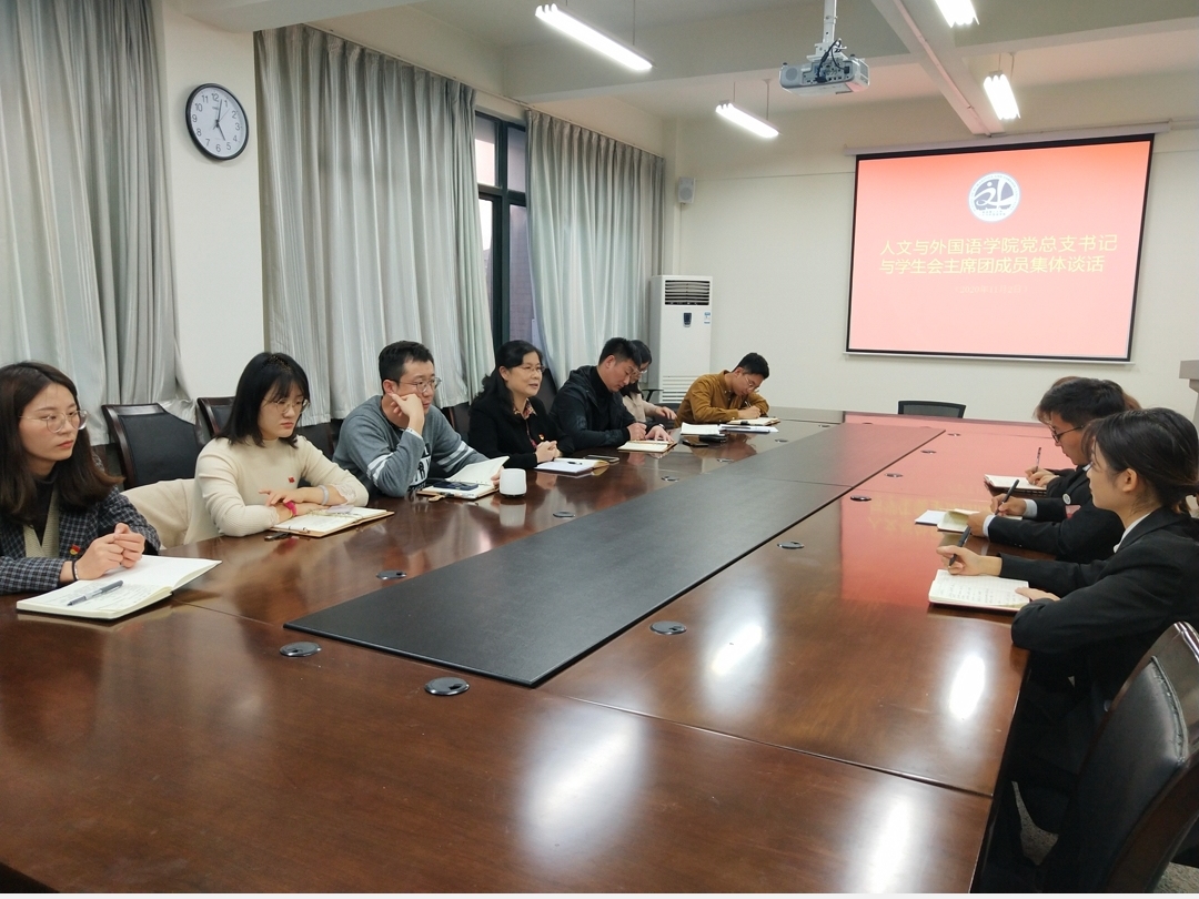 为加强学院党总支对学生会的领导,推动学生会工作顺利开展,11月2日下午4点,人文与外国语学院党总支于嘉陵江路主教学楼A410召开第二届学生会主席团座谈会,会议由分团委书记兼学工办主任马松主持,党总支书记王新、辅导员陈刚、辛雪梅、贾舒文、王才升、扎西央宗以及学生会主席团成员参加。