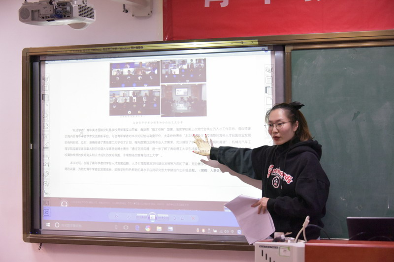 会议伊始,马馨甜从新闻格式、内容、照片等几个方面讲解如何编辑一篇优质新闻,并以新闻六要素“5W+1H”(When、Where、Who、What、Why、How)为抓手,表示新闻写作不能用文字随意堆砌,不能存在低级错误。马馨甜提醒同学们要注重新闻写作的逻辑性、真实性和简洁性,避免原则层面的错误出现。在新闻照片方面,马馨甜指出,照片的拍摄也有技巧性,并列举了不同场合的不同种照片格式。最后,马馨甜给同学们分享了自己的新闻写作心路历程,鼓励同学们要敢写多写,不断磨练自己。