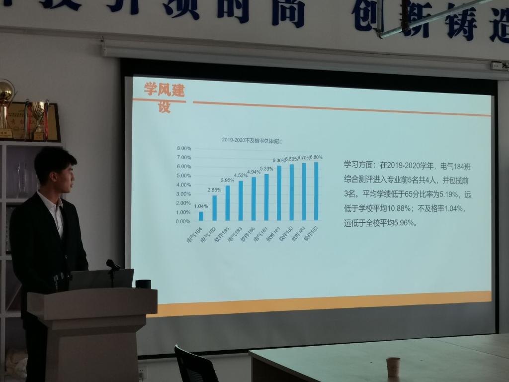 本次答辩参与答辩的是来自各班级的优秀代表,涵盖2017、2018、2019级共计25个班级。在主持人介绍答辩注意事项、评分规则后,答辩正式开始,各班答辩人经过抽签依次上台答辩,各班级通过精心制作的PPT课件,从班级基本情况、学风建设成果、成绩分析、学风创建举措、班团活动、未来规划等方面,向评委和现场观众展示了自己班级的风采和特色。经过角逐,最终评选出优良学风标兵班6个,优良学风班10个。