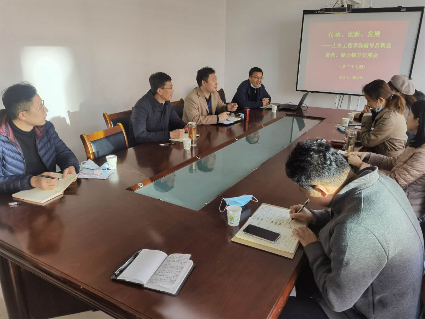 11月4日,土木工程学院于嘉陵江路校区C-1-2 311会议室举办第三十七期“传承、创新、发展”辅导员职业素养、能力提升交流会,本次交流会邀请到学生工作处副处长鞠志强与学院全体学生工作干部座谈交流,会议由学院党总支副书记邵先锋主持。