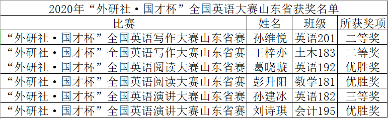 近日,“外研社·国才杯”全国英语写作、阅读、演讲大赛山东省赛在曲阜师范大学成功举行。经过激烈角逐,代表我校参加比赛的六名选手表现突出,最终在大赛中喜获佳绩,共获得二等奖两项,三等奖一项,优胜奖三项。