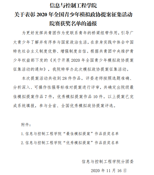 为更好发挥共青团作为党联系青年的桥梁纽带作用,引导广大青少年了解并有序参与国家政治生活,在亲身实践中体会中国特色社会主义制度优势、增强制度自信。根据共青团中央维护青少年权益部下发的《关于开展2020年全国青少年模拟政协提案征集活动的通知》,10月16日-11月14日,信息与控制工程学院开展青少年模拟政协提案征集活动。