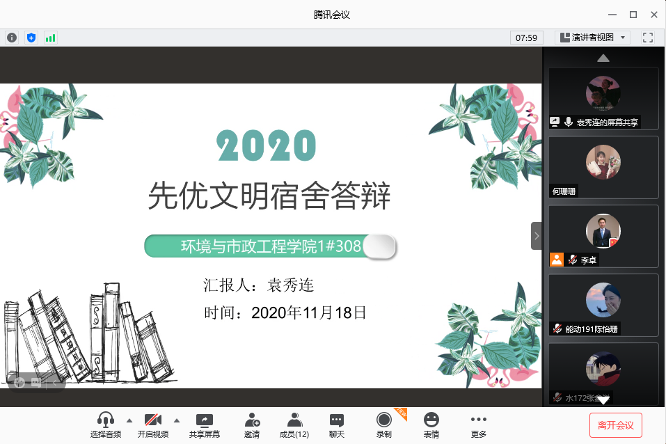 为学习贯彻习近平总书记系列重要讲话精神,积极践行社会主义核心价值观,加强文明公寓、平安公寓建设,环境与市政工程学院于11月18日下午通过腾讯会议举办了线上公寓先优答辩大会。出席本次答辩大会的评委有党总支副书记邵长飞,辅导员李卓、何珊珊,会议由李卓主持。