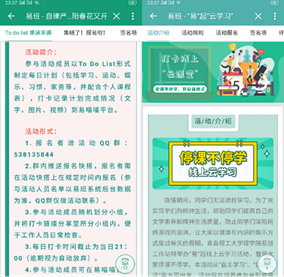 目前,理学院易班平台注册率已达75%。理学院易班工作分站本学期推文共发布324篇,活动快搭34篇,工作分站秉承“互联网+”工作思路,设计了“易班+学风、易班+院风、易班+班风”建设的系列活动,其中“身边榜样,前行力量”、“阳春花又开,自律严以待”、新生风采展、线上云学习等多项活动得到师生一致肯定与好评,实现了线上线下协同并进,正确引领大学生思想。本学期校易班周排名,共6个评比周排名在前两名,其中5个评比周居第一。在疫情期间,向广大师生推送了相关新闻及推文,并制作了防疫视频,充分利用易班平台积极支持防疫工作,自觉承担防控责任。理学院易班工作分站以喜闻乐见的形式,推送校内外要闻,向师生传递正能量,筑起了大学生的网络思政平台。