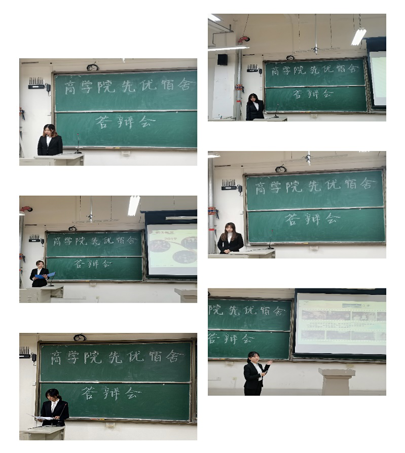 经过前期报名申请、学院初审,最终共有20个宿舍进入答辩环节。各宿舍代表依次进行先优学风宿舍、先优文明宿舍答辩,从宿舍概况、学风建设、思想建设、综合素质、未来发展等方面进行介绍,展现了宿舍生活的温馨和谐以及学习生活中互助友爱的浓厚氛围。宿舍集体工整的课堂笔记、名列前茅的学分绩点、各类获奖证书、各类实践活动,引起现场阵阵惊叹和掌声。温馨宿舍的笑语声声,迎难而上的口号铿铿,相约考研的誓言铮铮,展现了商院学子“乘风破浪会有时,直挂云帆济沧海”的精神面貌。最终,经过激烈角逐,B3#908、B4#220、B4#401宿舍获得先优学风宿舍一等奖,B4#912、B4#607、B4#1013宿舍获得先优文明宿舍一等奖。