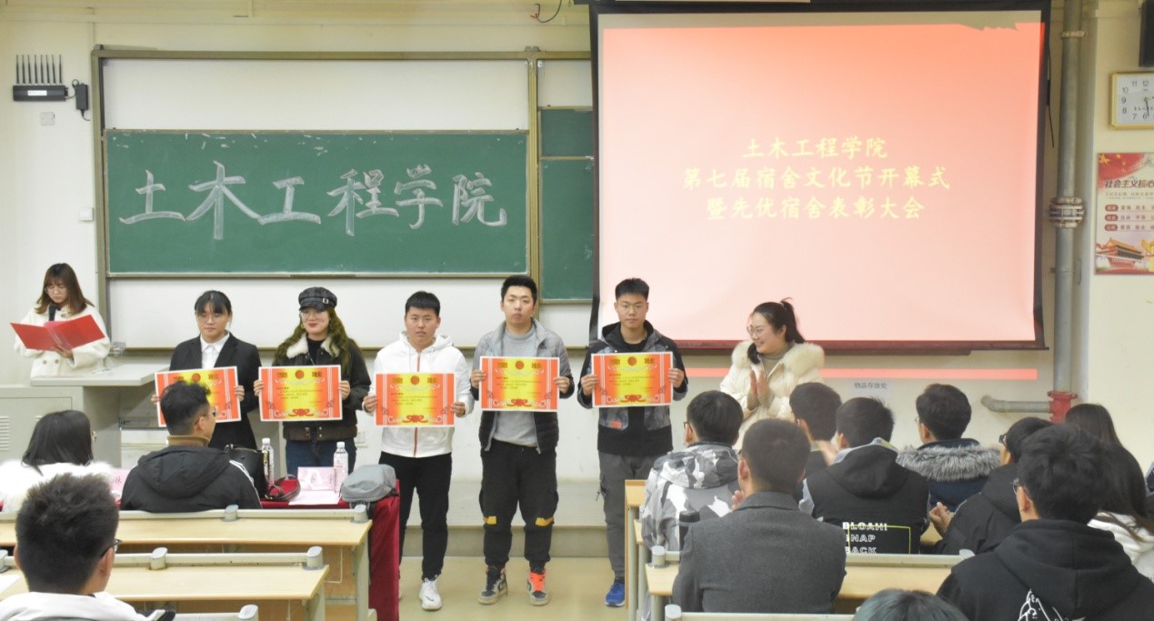 11月25日,土木工程学院于嘉陵江路校区主教学楼301教室举行第七届宿舍文化节开幕式暨先优宿舍表彰大会。学院党总支副书记邵先锋,分团委书记王中帅,辅导员杜诗琳、李恺、刘晓彤、孙宇出席开幕式。