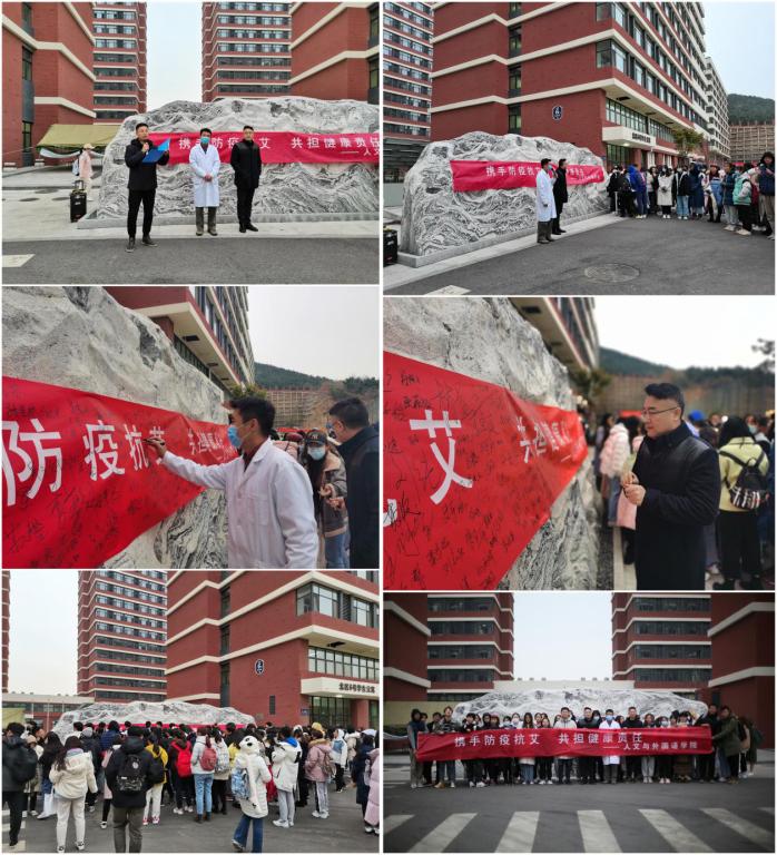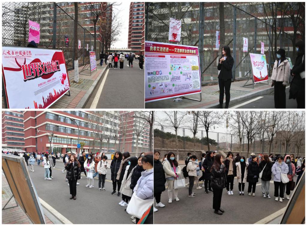 活动伊始,王才升向同学们宣传正确的防治知识,引导同学树立社会责任意识和道德观念,携手应对新冠肺炎、艾滋病等全球范围内重大传染病。崔晓健进行宣讲,指出大学生群体依然是高感人群,倡导大家课余时间加强体育锻炼,不断提高免疫力,实现远离艾滋的宣传目标。最后号召大家在印有“携手防疫抗艾共担健康责任”的横幅上签名。同学们积极参与,依次签名拍照,并领取“红丝带”胸针。同学们用自己的实际行动参与到抗击艾滋的行动中。