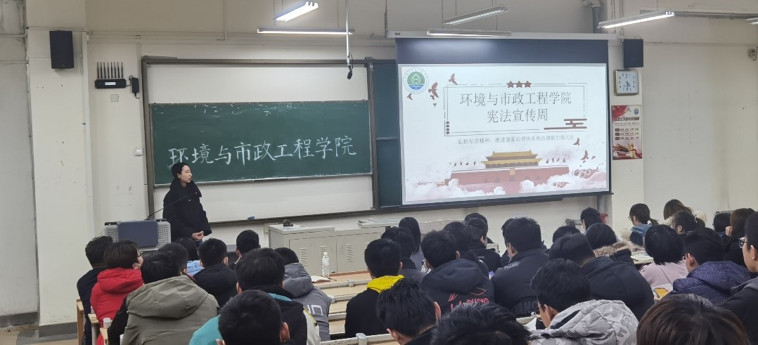 今年12月4日是第七个国家宪法日,也将迎来第三个“宪法宣传周”。为进一步做好大学生法治宣传教育,引导同学们学法、懂法、守法和用法,提升同学们对宪法的认识,创建和谐校园、平安校园,12月2日,环境与市政工程学院在嘉陵江路主教学楼B301举办“深入学习宣传习近平法治思想,大力弘扬宪法精神”主题活动。本次活动由学院2020级辅导员宫克菲主持,相关老师和学生骨干代表参与此次活动。