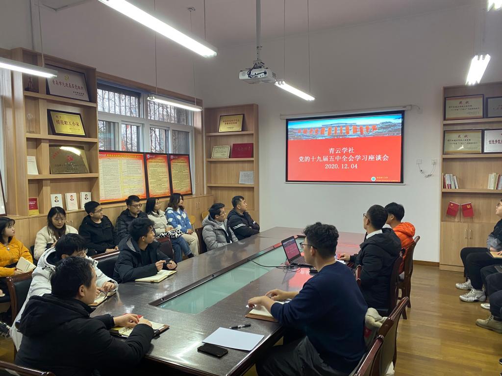 12月4日,环境与市政工程学院青云学社举行学习党的十九届五中全会座谈会,学院党总支副书记邵长飞出席座谈会,辅导员王登榜主持座谈会,学院思政类社团青云学社相关同学参加会议。