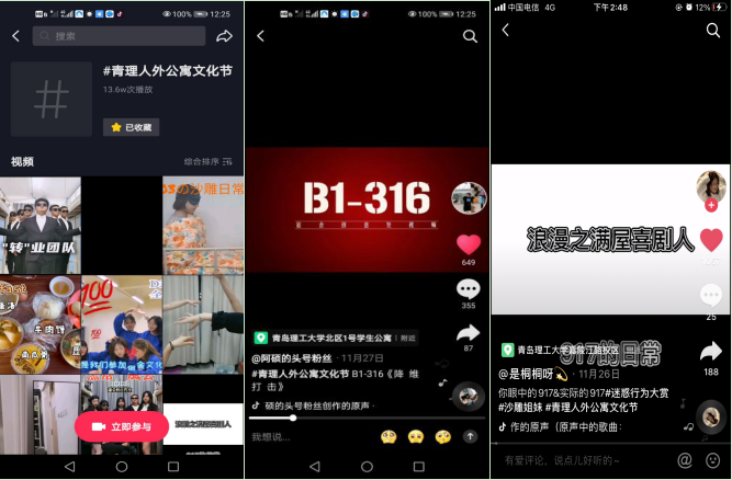 11月23日至11月28日,学院举办文暖寓语公寓文化节之创意短视频大赛。为弘扬主旋律、展现我院积极向上的青年形象,我院积极举办公寓创意短视频大赛。活动发起后,同学们积极响应,稿件纷涌而至,总共有27个宿舍参加,学生自发通过抖音、QQ空间等平台宣传总数达5000人次,抖音平台话题最终浏览量达到13.6万次,活动取得热烈反响。最终,比赛评选出B1#316获一等奖,B1#311等3个宿舍获二等奖,D3#1006等5个宿舍获三等奖。